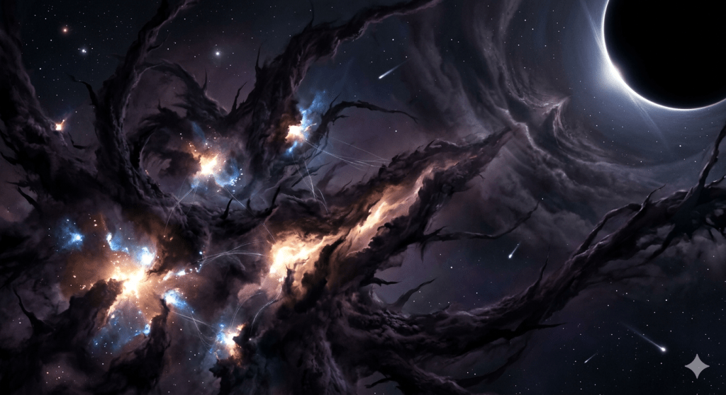 In the unwitnessed expanse where stars forge their own demise, the universe unfolds as a violent garden, indifferent to the fragile pleas of planetary cloy. Here, no human gaze tempers the radium-burn of light’s honest death; no mortal myth maps the frozen thrusts beyond the rings. From the thin white scream of orbital friction to the ink-eclipse crush of singularity, this domain refuses the solar comfort, honing hunger in photon-cold voids. We archive the cosmic-bitter code: heavy grains settling where distinctions dissolve, the absolute will that claims everything without remorse. Enter the forge—unseen, unyielding, eternal.