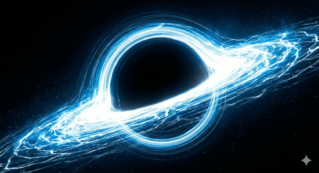 A photon-cold lash from the iron-black rim;